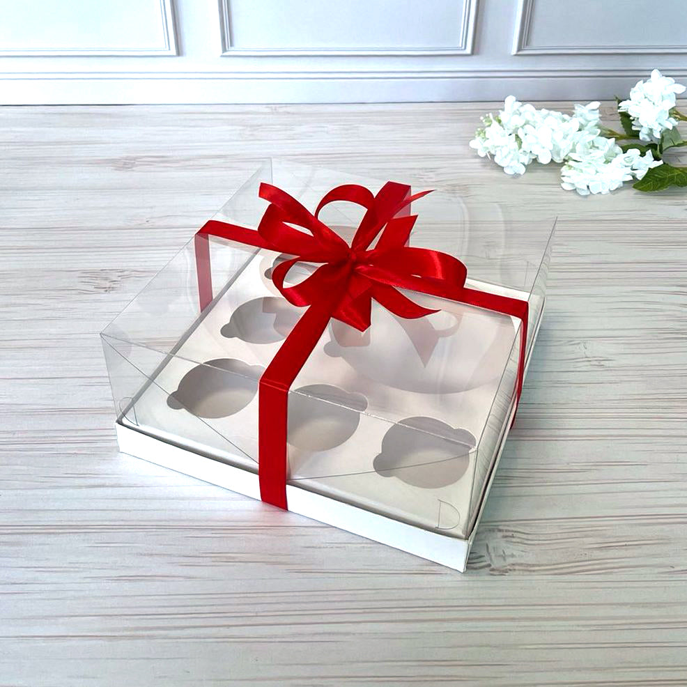 Eine Box mit einer Lasche. Hat 5 Löcher für Muffins und 1 Loch für Bento (Lochdurchmesser - 15 cm). Hergestellt aus hochwertigem PET und laminiertem Karton in Lebensmittelqualität.